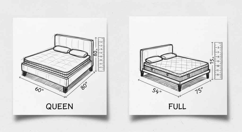 The critical insight: Queen beds aren’t just bigger—they’re proportioned differently. That additional 5 inches in length accommodates taller sleepers (6’2″ and above) who find their feet dangling off full beds. The 6-inch width expansion transforms shared sleeping from tolerable to comfortable.