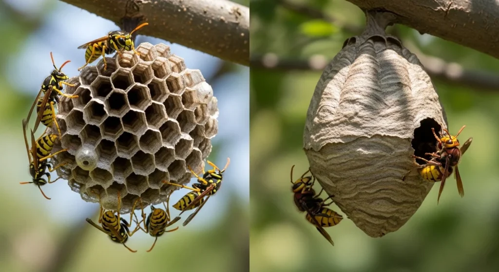 | Location | Underground, wall voids, eaves, open branches (paper wasps) | High in trees, hollow trees, building cavities, exposed branches |